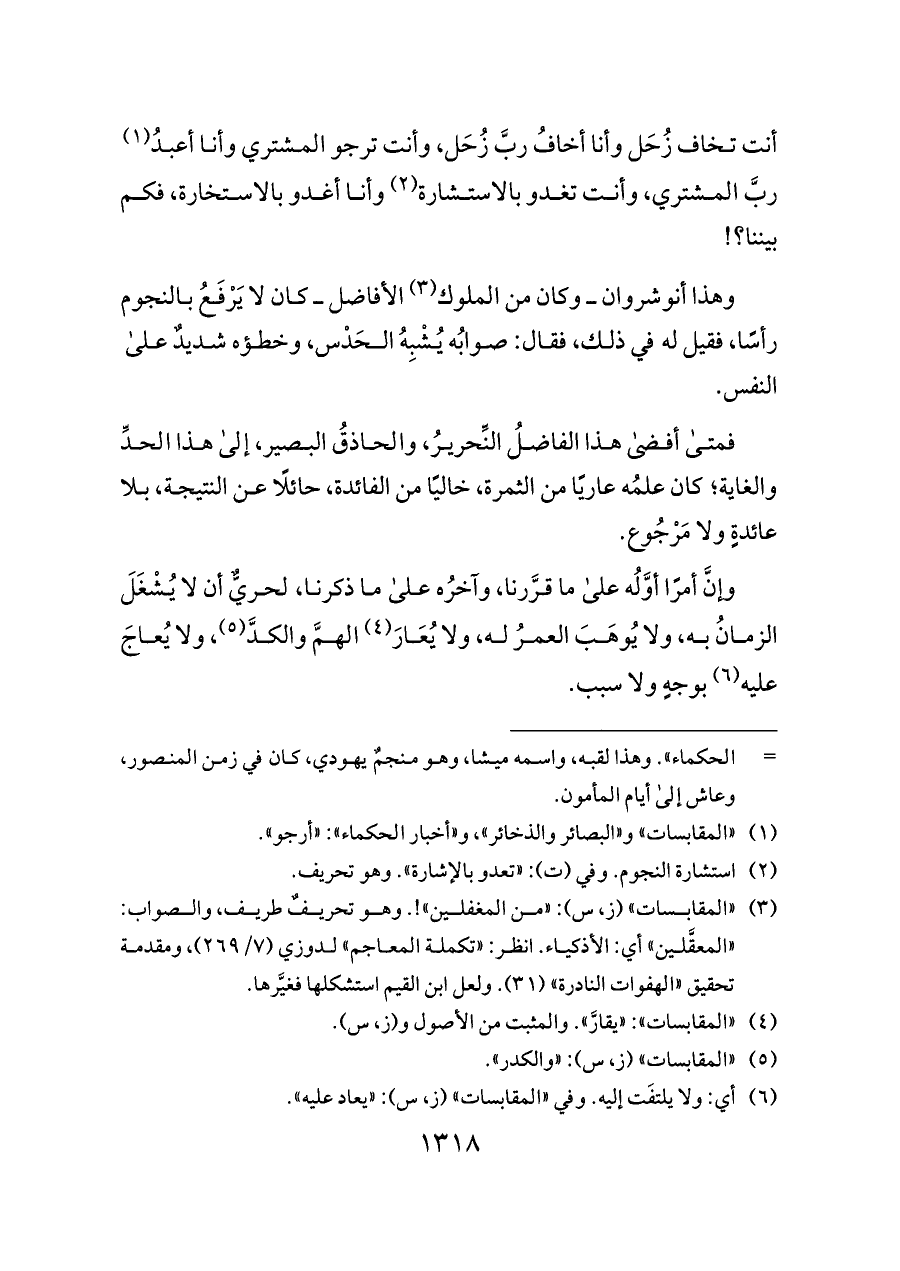 وهذا أنوشروان ــ وكان من الملوك (¬٣) الأفاضل ــ كان لا يَرْفَعُ بالنجوم رأسًا، فقيل له في ذلك، فقال: صوابُه يُشْبِهُ الحَدْس، وخطؤه شديدٌ على النفس.