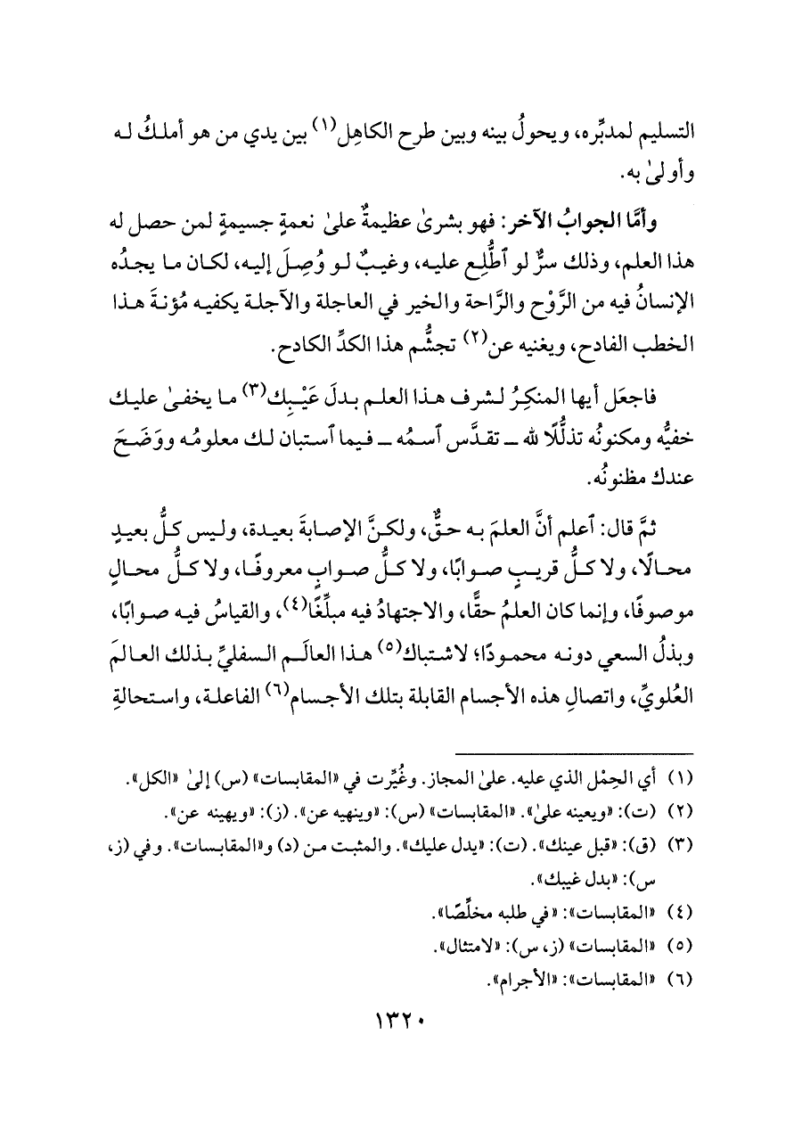 ثمَّ قال: اعلم أنَّ العلمَ به حقٌّ، ولكنَّ الإصابةَ بعيدة، وليس كلُّ بعيدٍ محالًا، ولا كلُّ قريبٍ صوابًا، ولا كلُّ صوابٍ معروفًا، ولا كلُّ محالٍ موصوفًا، وإنما كان العلمُ حقًّا، والاجتهادُ فيه مبلِّغًا (¬٤)، والقياسُ فيه صوابًا، وبذلُ السعي دونه محمودًا؛ لاشتباك (¬٥) هذا العالَم السفليِّ بذلك العالَم العُلويِّ، واتصالِ هذه الأجسام القابلة بتلك الأجسام (¬٦) الفاعلة، واستحالةِ