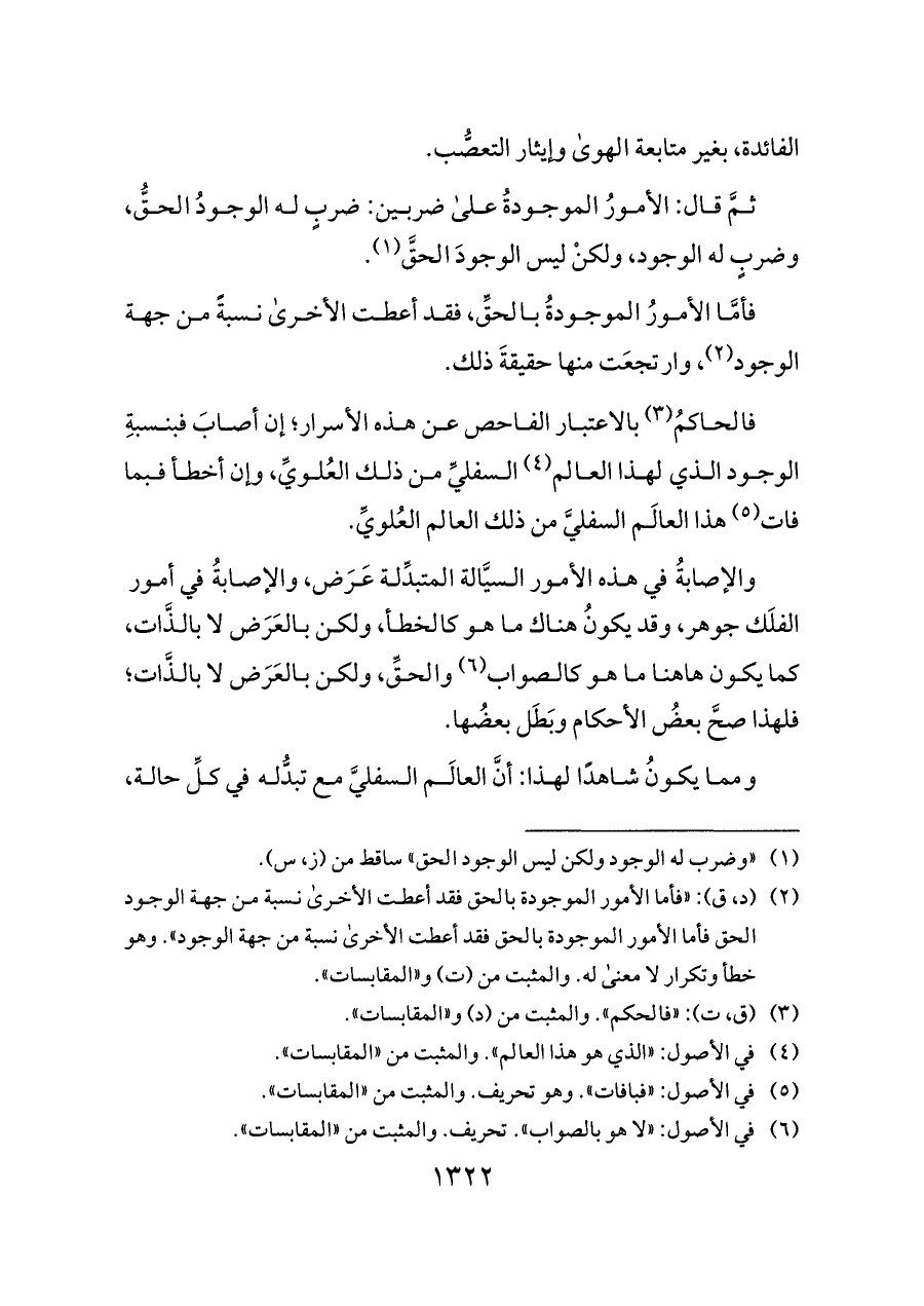 (¬٢) (د، ق): «فأما الأمور الموجودة بالحق فقد أعطت الأخرى نسبة من جهة الوجود الحق فأما الأمور الموجودة بالحق فقد أعطت الأخرى نسبة من جهة الوجود». وهو خطأ وتكرار لا معنى له. والمثبت من (ت) و «المقابسات».