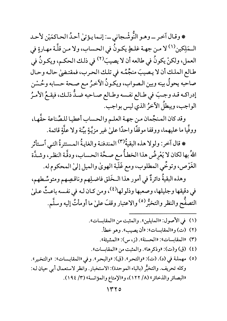 * قال آخر: ولولا هذه البقيةُ (¬٣) المندفنة والغايةُ المستترةُ التي استأثر اللهُ بها لكان لا يَعْرِضُ هذا الخطأُ مع صحَّة الحساب، ودقَّة النظر، وشدَّة الغَوْص، وتوخِّي المطلوب، ومع غَلَبة الهوى والميل إلى المحكوم له.
