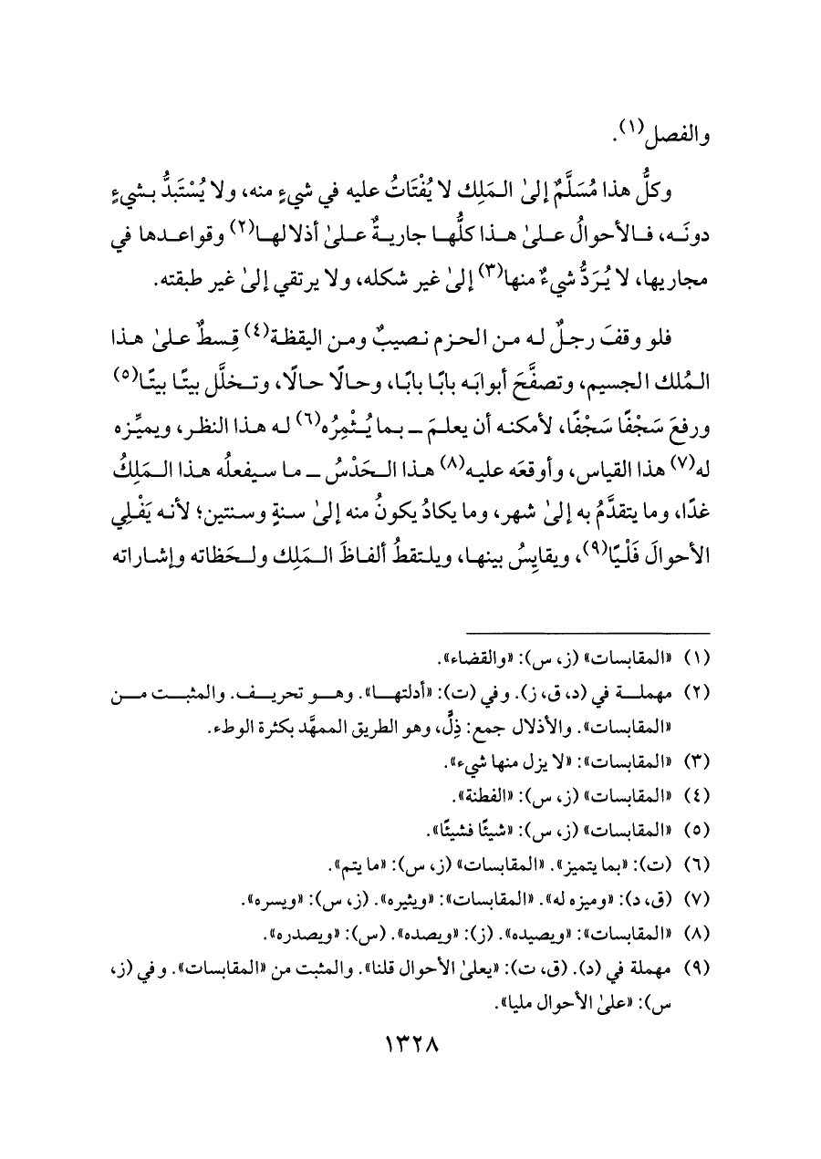 (¬٩) مهملة في (د). (ق، ت): «يعلى الأحوال قلنا». والمثبت من «المقابسات». وفي (ز، س): «على الأحوال مليا».