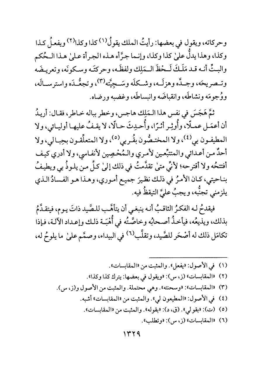 ثمَّ هَجَسَ في نفس هذا المَلِك هاجس، وخطر بباله خاطر، فقال: أريدُ أن أعمَل عملًا، وأُوثِر أثرًا، وأُحدِثَ حالًا، لا يقفُ عليها أوليائي، ولا المطيفون بي (¬٤)، ولا المختصُّون بقُربي (¬٥)، ولا المتعلِّقون بحِبالي، ولا أحدٌ من أعدائي والمتتبِّعين لأمري والمُحْصِين لأنفاسي، ولا أدري كيف أفتتحُه ولا أقترحه؛ لأنِّي متى تقدَّمتُ في ذلك إلى كلِّ من يلوذُ بي ويطيفُ بناحيتي، كان الأمرُ في ذلك نظيرَ جميع أموري، وهذا هو الفسادُ الذي يلزمني تجنُّبه، ويجبُ عليَّ التيقظُ فيه.