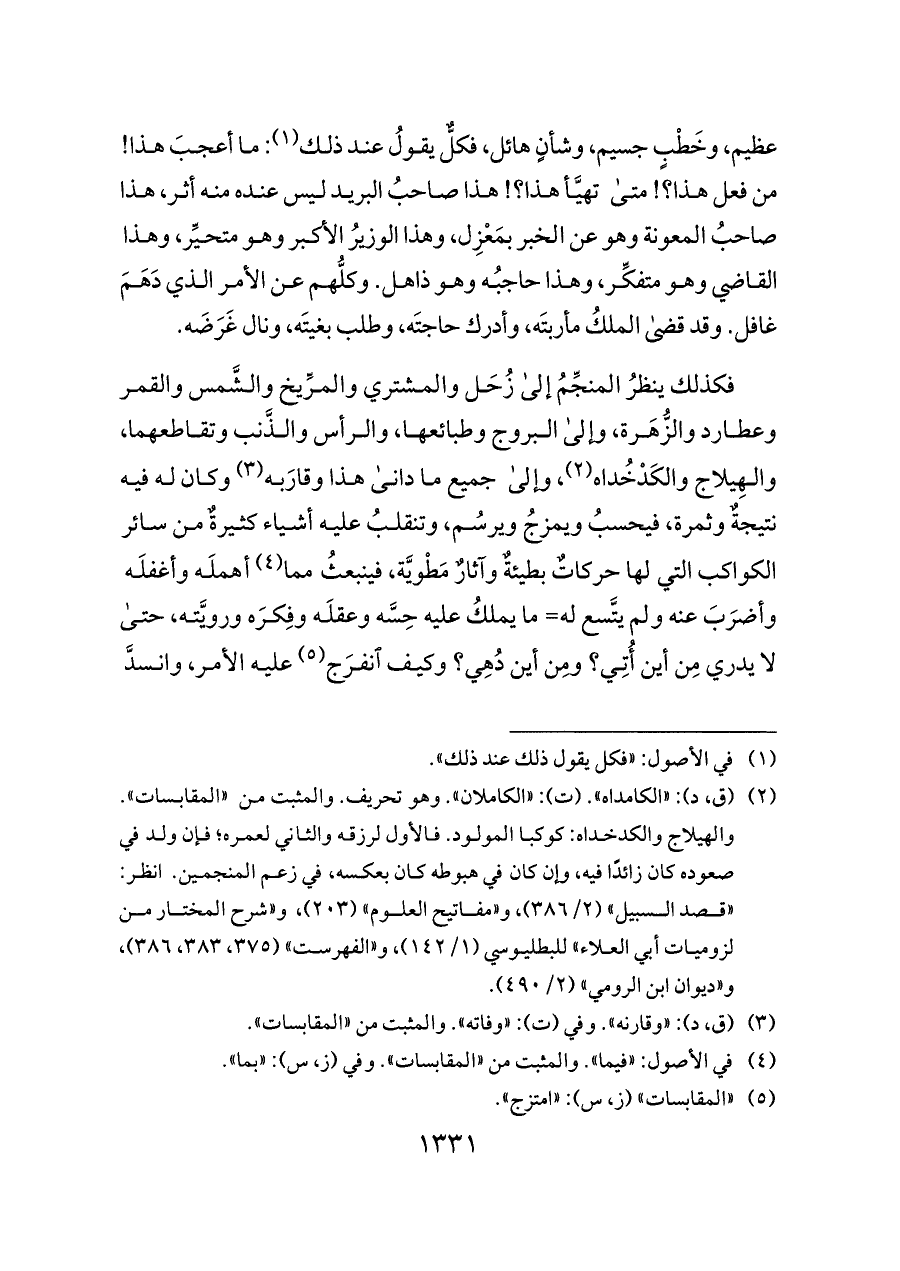 فكذلك ينظرُ المنجِّمُ إلى زُحَل والمشتري والمرِّيخ والشَّمس والقمر وعطارد والزُّهَرة، وإلى البروج وطبائعها، والرأس والذَّنب وتقاطعهما، والهِيلاج والكَدْخُداه (¬٢)، وإلى جميع ما دانى هذا وقارَبه (¬٣) وكان له فيه نتيجةٌ وثمرة، فيحسبُ ويمزجُ ويرسُم، وتنقلبُ عليه أشياء كثيرةٌ من سائر الكواكب التي لها حركاتٌ بطيئةٌ وآثارٌ مَطْويَّة، فينبعثُ مما (¬٤) أهملَه وأغفلَه وأضرَبَ عنه ولم يتَّسع له= ما يملكُ عليه حِسَّه وعقلَه وفِكرَه ورويَّته، حتى لا يدري مِن أين أُتِي؟ ومِن أين دُهِي؟ وكيف انفرَج (¬٥) عليه الأمر، وانسدَّ