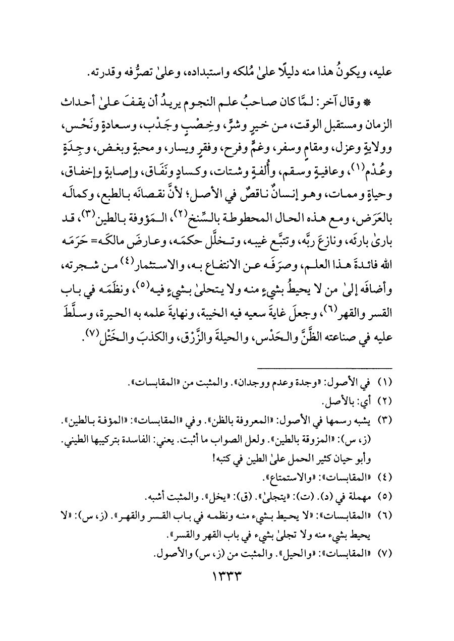 * وقال آخر: لمَّا كان صاحبُ علم النجوم يريدُ أن يقفَ على أحداث الزمان ومستقبل الوقت، من خيرٍ وشرٍّ، وخِصْبٍ وجَدْب، وسعادةٍ ونَحْس، وولايةٍ وعزل، ومقامٍ وسفر، وغمٍّ وفرح، وفقرٍ ويسار، ومحبةٍ وبغض، وجِدَةٍ وعُدْم (¬١)، وعافيةٍ وسقم، وأُلفةٍ وشتات، وكسادٍ ونَفَاق، وإصابةٍ وإخفاق، وحياةٍ وممات، وهو إنسانٌ ناقصٌ في الأصل؛ لأنَّ نقصانَه بالطبع، وكمالَه بالعَرَض، ومع هذه الحال المحطوطة بالسِّنخ (¬٢)، المَؤوفة بالطين (¬٣)، قد بارى بارئَه، ونازعَ ربَّه، وتتبَّع غيبه، وتخلَّل حكمَه، وعارضَ مالكَه= حَرَمَه الله فائدةَ هذا العلم، وصرَفَه عن الانتفاع به، والاستثمار (¬٤) من شجرته، وأضافَه إلى من لا يحيطُ بشيءٍ منه ولا يتحلى بشيءٍ فيه (¬٥)، ونظَمَه في باب القسر والقهر (¬٦)، وجعلَ غايةَ سعيه فيه الخيبة، ونهايةَ علمه به الحيرة، وسلَّطَ عليه في صناعته الظَّنَّ والحَدْس، والحيلةَ والزَّرْق، والكذبَ والخَتْل (¬٧).