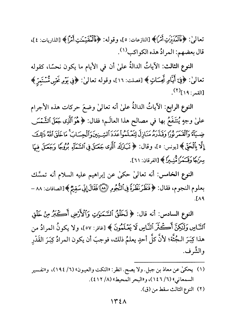 النوع الرابع: الآياتُ الدالةُ على أنه تعالى وضعَ حركات هذه الأجرام على وجهٍ يُنتَفَعُ بها في مصالح هذا العالَم؛ فقال: {هُوَ الَّذِي جَعَلَ الشَّمْسَ ضِيَاءً وَالْقَمَرَ نُورًا وَقَدَّرَهُ مَنَازِلَ لِتَعْلَمُوا عَدَدَ السِّنِينَ وَالْحِسَابَ مَا خَلَقَ اللَّهُ ذَلِكَ إِلَّا بِالْحَقِّ} [يونس: ٥]، وقال: {تَبَارَكَ الَّذِي جَعَلَ فِي السَّمَاءِ بُرُوجًا وَجَعَلَ فِيهَا سِرَاجًا وَقَمَرًا مُنِيرًا} [الفرقان: ٦١].