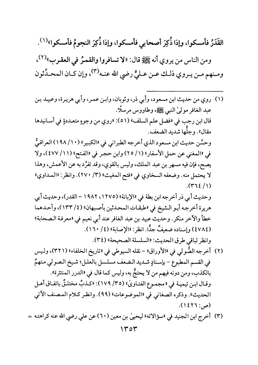 (¬٣) أخرج ابن الجنيد في «سؤالاته» ليحيى بن معين (٦٠) عن علي رضي الله عنه كراهته للزواج أو السفر في المحاق أو إذا نزل القمر العقرب، وإسناده ضعيفٌ جدًّا، وحكم عليه ابن حجر في «اللسان» (٤/ ٣٢٤) بالنكارة؛ لأنَّ المعروف عن علي الإنكار على من يعتقد ذلك، أمَّا ابن معين فحكى ابن الجنيد عنه أنه لم ينكره، ولعلَّه إنما لم ينكره على راويه عمر بن مجاشع ورأى العهدة فيه على من دونه.