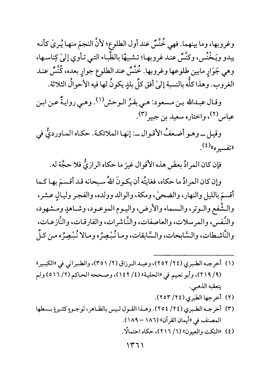 وغروبها، وما بينهما. فهي خُنَّسٌ عند أول الطلوع؛ لأنَّ النجمَ منها يُرى كأنه يبدو ويَخْنُس، وكنَّسٌ عند غروبها؛ تشبيهًا بالظِّباء التي تأوي إلى كِناسها، وهي جَوَارٍ مابين طلوعها وغروبها. خُنَّسٌ عند الطلوع جوارٍ بعده، كُنَّسٌ عند الغروب. وهذا كلُّه بالنسبة إلى أفق كلِّ بلدٍ يكونُ لها فيه الأحوالُ الثلاثة.