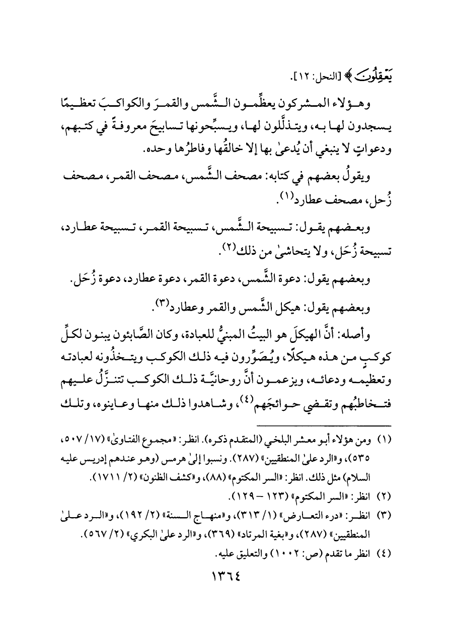 وهؤلاء المشركون يعظِّمون الشَّمس والقمرَ والكواكبَ تعظيمًا يسجدون لها به، ويتذلَّلون لها، ويسبِّحونها تسابيحَ معروفةً في كتبهم، ودعواتٍ لا ينبغي أن يُدعى بها إلا خالقُها وفاطرُها وحده.