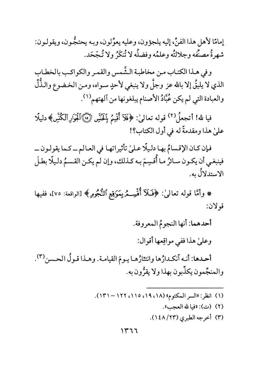 فإن كان الإقسامُ بها دليلًا على تأثيراتها في العالم ــ كما يقولون ــ فينبغي أن يكون سائرُ ما أُقسِمَ به كذلك، وإن لم يكن القسمُ دليلًا بطلَ الاستدلالُ به.