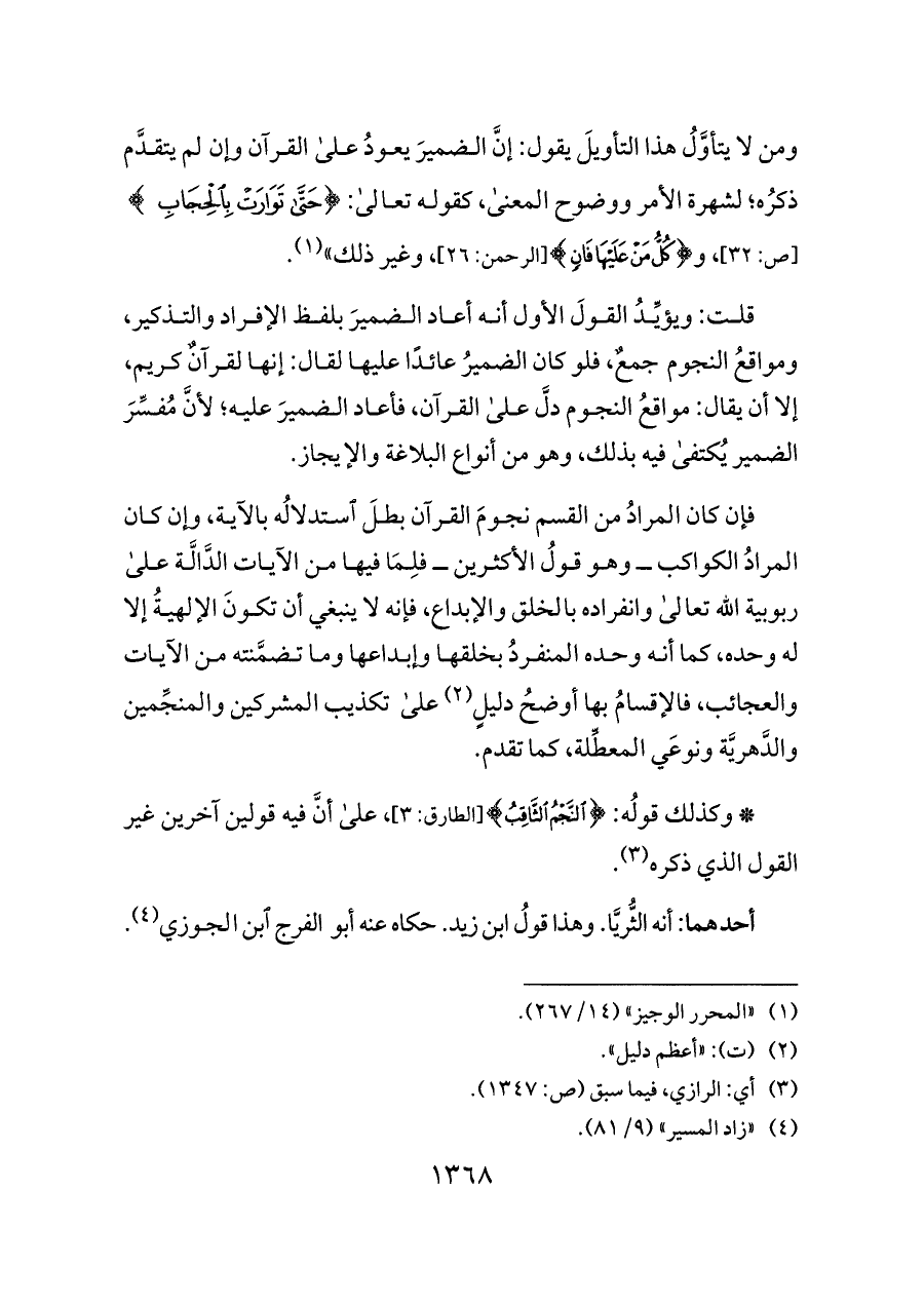 قلت: ويؤيِّدُ القولَ الأول أنه أعاد الضميرَ بلفظ الإفراد والتذكير، ومواقعُ النجوم جمعٌ، فلو كان الضميرُ عائدًا عليها لقال: إنها لقرآنٌ كريم، إلا أن يقال: مواقعُ النجوم دلَّ على القرآن، فأعاد الضميرَ عليه؛ لأنَّ مُفسِّرَ الضمير يُكتفى فيه بذلك، وهو من أنواع البلاغة والإيجاز.