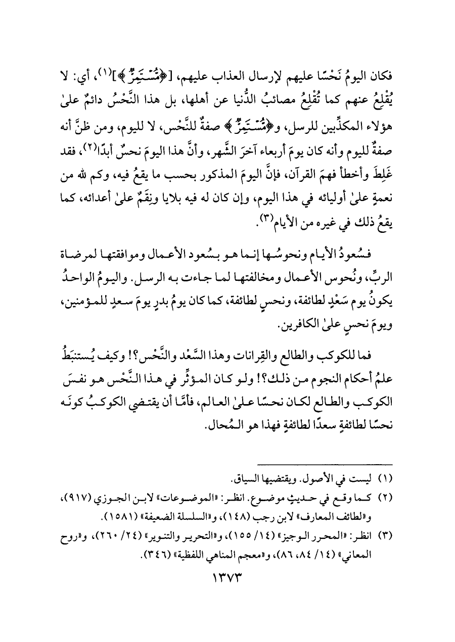 فسُعودُ الأيام ونحوسُها إنما هو بسُعود الأعمال وموافقتها لمرضاة الربِّ، ونُحوس الأعمال ومخالفتها لما جاءت به الرسل. واليومُ الواحدُ يكونُ يوم سَعْدٍ لطائفة، ونحسٍ لطائفة، كما كان يومُ بدرٍ يومَ سعدٍ للمؤمنين، ويومَ نحسٍ على الكافرين.