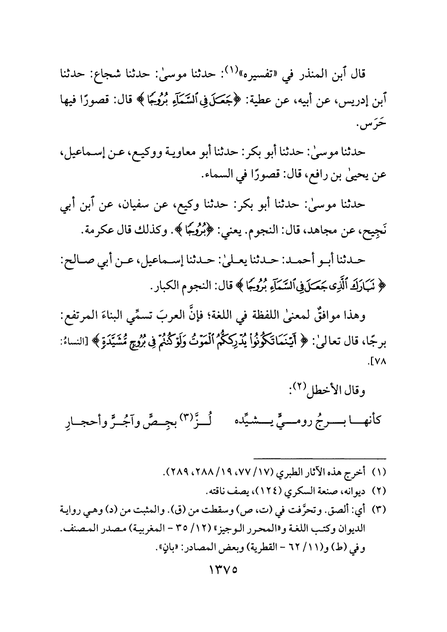 قال ابن المنذر في «تفسيره» (¬١): حدثنا موسى: حدثنا شجاع: حدثنا ابن إدريس، عن أبيه، عن عطية: {جَعَلَ فِي السَّمَاءِ بُرُوجًا} قال: قصورًا فيها حَرَس.