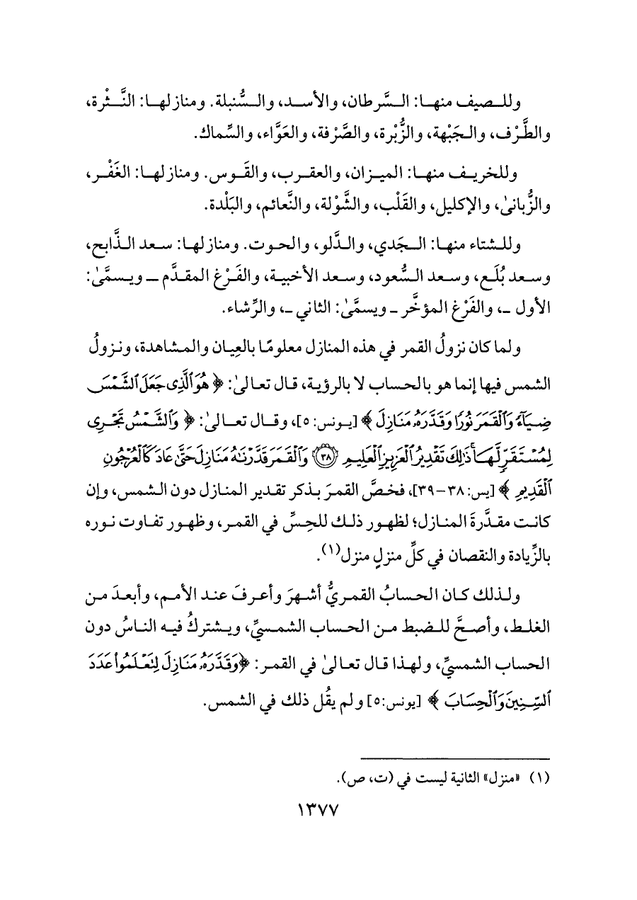 ولما كان نزولُ القمر في هذه المنازل معلومًا بالعِيان والمشاهدة، ونزولُ الشمس فيها إنما هو بالحساب لا بالرؤية، قال تعالى: {هُوَ الَّذِي جَعَلَ الشَّمْسَ ضِيَاءً وَالْقَمَرَ نُورًا وَقَدَّرَهُ مَنَازِلَ} [يونس: ٥]، وقال تعالى: {وَالشَّمْسُ تَجْرِي لِمُسْتَقَرٍّ لَهَا ذَلِكَ تَقْدِيرُ الْعَزِيزِ الْعَلِيمِ (٣٨) وَالْقَمَرَ قَدَّرْنَاهُ مَنَازِلَ حَتَّى عَادَ كَالْعُرْجُونِ الْقَدِيمِ} [يس: ٣٨ - ٣٩]، فخصَّ القمرَ بذكر تقدير المنازل دون الشمس، وإن كانت مقدَّرةَ المنازل؛ لظهور ذلك للحِسِّ في القمر، وظهور تفاوت نوره بالزِّيادة والنقصان في كلِّ منزلٍ منزل (¬١).