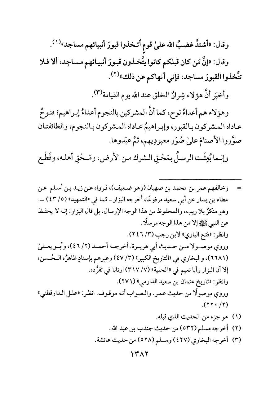 وقال: «اشتدَّ غضبُ الله على قومٍ اتخذوا قبورَ أنبيائهم مساجد» (¬١).