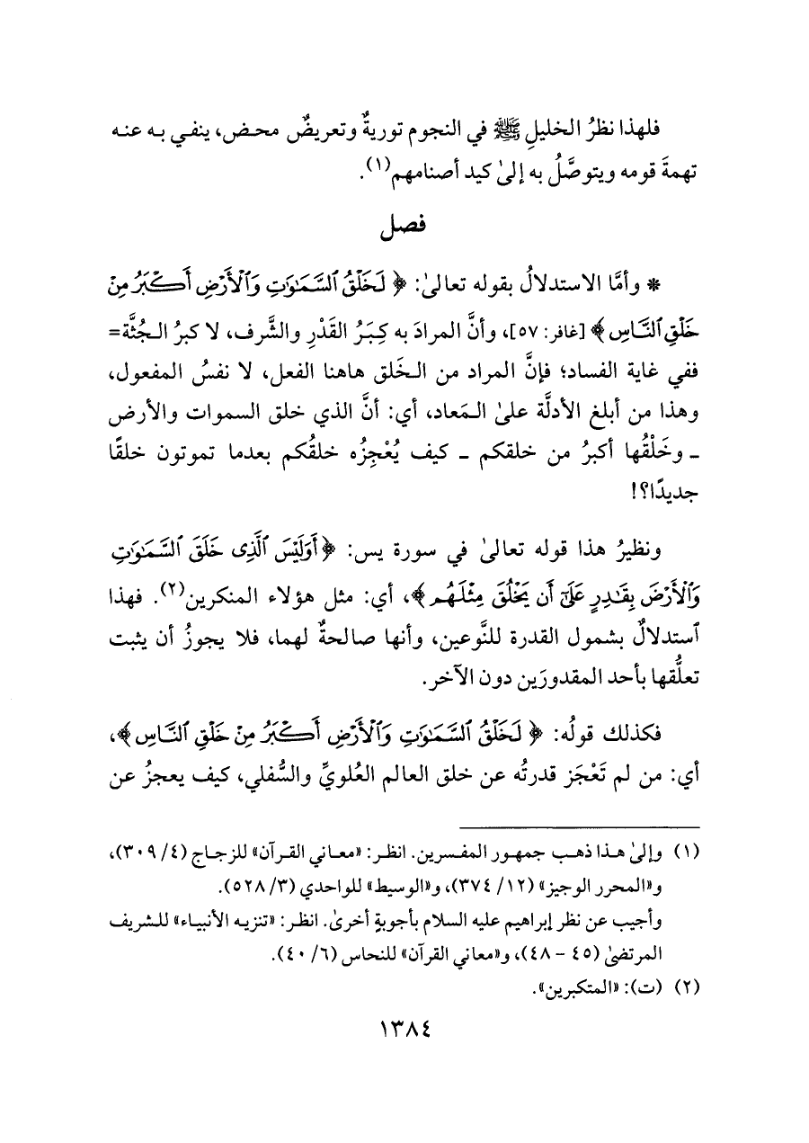 * وأمَّا الاستدلالُ بقوله تعالى: {لَخَلْقُ السَّمَاوَاتِ وَالْأَرْضِ أَكْبَرُ مِنْ خَلْقِ النَّاسِ} [غافر: ٥٧]، وأنَّ المرادَ به كِبَرُ القَدْرِ والشَّرف، لا كبرُ الجُثَّة= ففي غاية الفساد؛ فإنَّ المراد من الخَلق هاهنا الفعل، لا نفسُ المفعول، وهذا من أبلغ الأدلَّة على المَعاد، أي: أنَّ الذي خلق السموات والأرض ــ وخَلْقُها أكبرُ من خلقكم ــ كيف يُعْجِزُه خلقُكم بعدما تموتون خلقًا جديدًا؟!