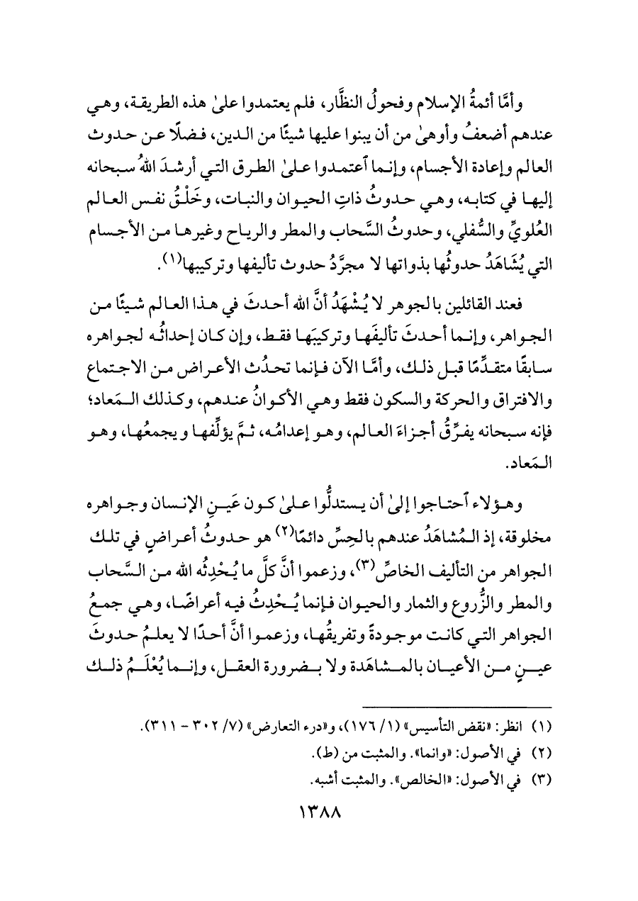 وأمَّا أئمةُ الإسلام وفحولُ النظَّار، فلم يعتمدوا على هذه الطريقة، وهي عندهم أضعفُ وأوهى من أن يبنوا عليها شيئًا من الدين، فضلًا عن حدوث العالم وإعادة الأجسام، وإنما اعتمدوا على الطرق التي أرشدَ اللهُ سبحانه إليها في كتابه، وهي حدوثُ ذاتِ الحيوان والنبات، وخَلْقُ نفس العالم العُلويِّ والسُّفلي، وحدوثُ السَّحاب والمطر والرياح وغيرها من الأجسام التي يُشَاهَدُ حدوثُها بذواتها لا مجرَّدُ حدوث تأليفها وتركيبها (¬١).