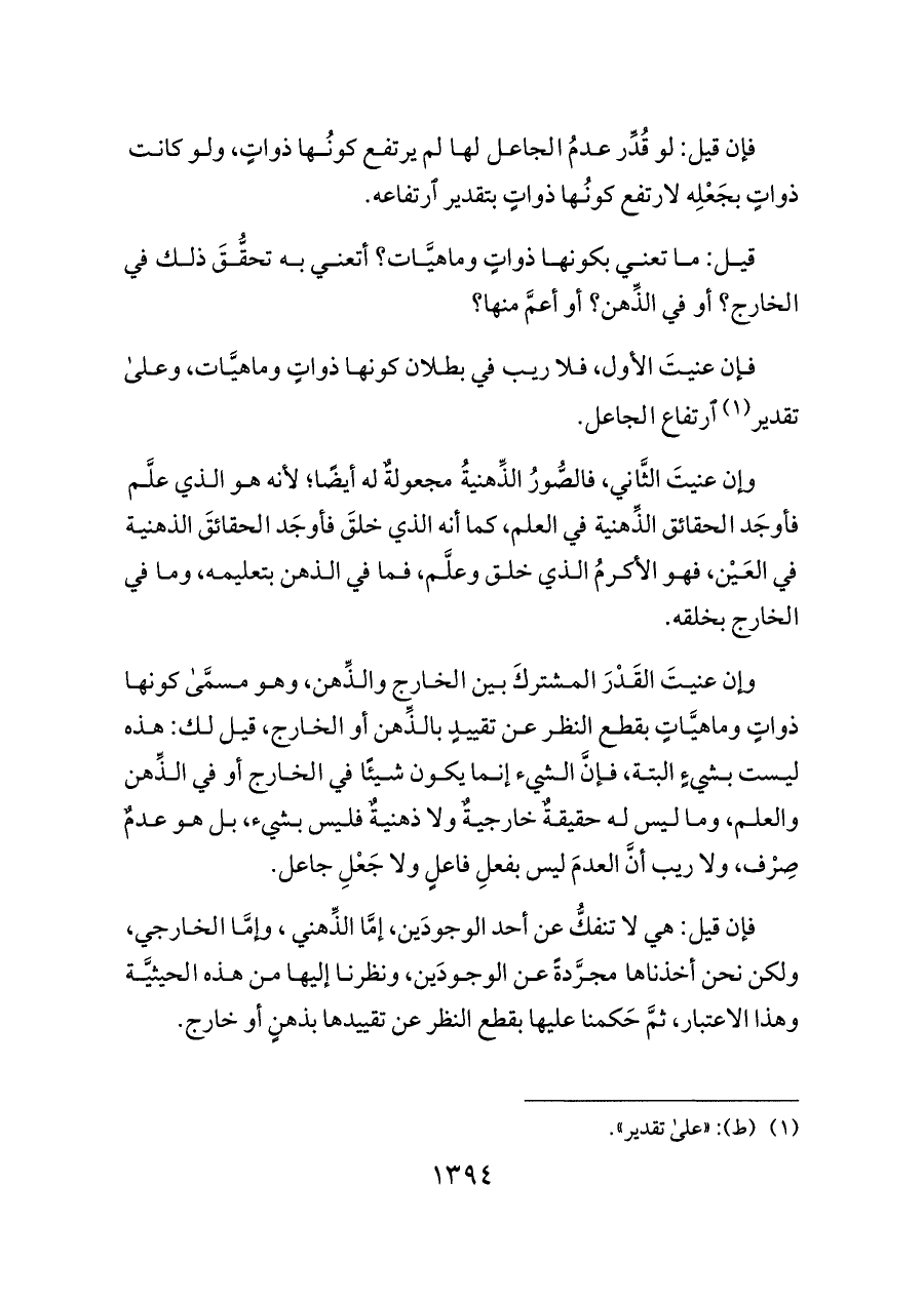 وإن عنيتَ القَدْرَ المشتركَ بين الخارج والذِّهن، وهو مسمَّى كونها ذواتٍ وماهيَّاتٍ بقطع النظر عن تقييدٍ بالذِّهن أو الخارج، قيل لك: هذه ليست بشيءٍ البتة، فإنَّ الشيء إنما يكون شيئًا في الخارج أو في الذِّهن والعلم، وما ليس له حقيقةٌ خارجيةٌ ولا ذهنيةٌ فليس بشيء، بل هو عدمٌ صِرْف، ولا ريب أنَّ العدمَ ليس بفعلِ فاعلٍ ولا جَعْلِ جاعل.