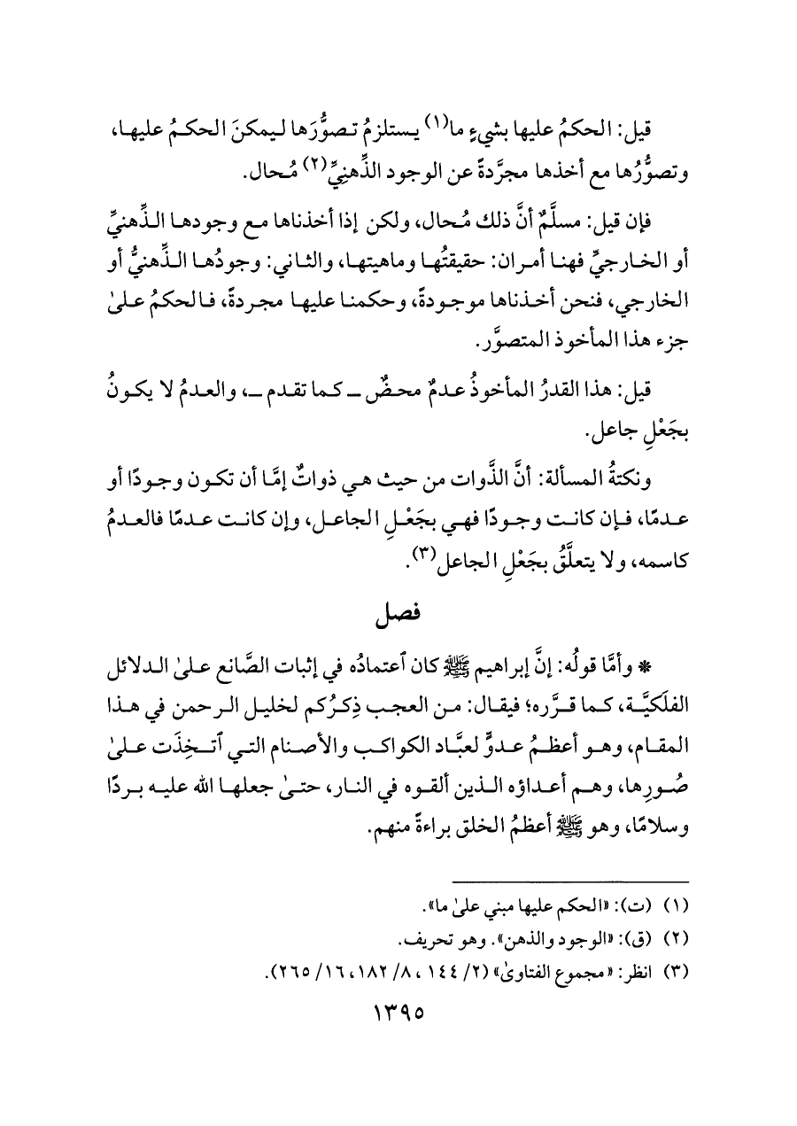 * وأمَّا قولُه: إنَّ إبراهيم - صلى الله عليه وسلم - كان اعتمادُه في إثبات الصَّانع على الدلائل الفلَكيَّة، كما قرَّره؛ فيقال: من العجب ذِكرُكم لخليل الرحمن في هذا المقام، وهو أعظمُ عدوٍّ لعبَّاد الكواكب والأصنام التي اتخِذَت على صُورِها، وهم أعداؤه الذين ألقوه في النار، حتى جعلها الله عليه بردًا وسلامًا، وهو - صلى الله عليه وسلم - أعظمُ الخلق براءةً منهم.