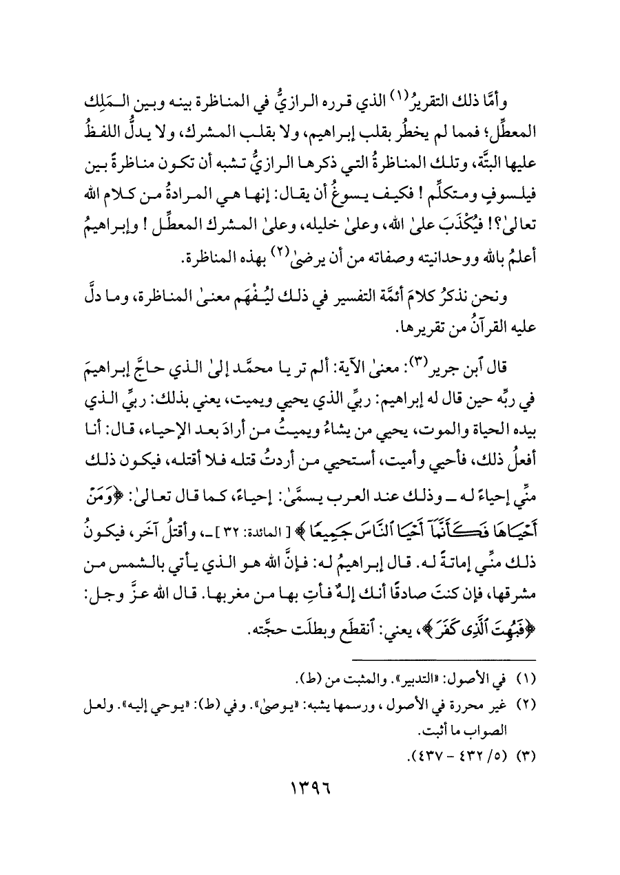 ونحن نذكرُ كلامَ أئمَّة التفسير في ذلك ليُفْهَم معنى المناظرة، وما دلَّ عليه القرآنُ من تقريرها.
