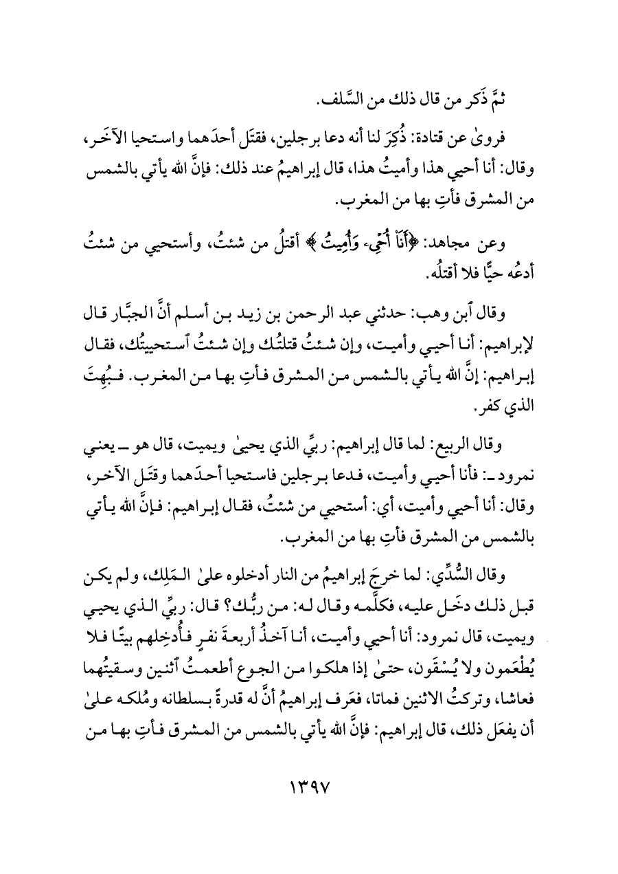 وقال الربيع: لما قال إبراهيم: ربِّي الذي يحيى ويميت، قال هو ــ يعني نمرود ــ: فأنا أحيي وأميت، فدعا برجلين فاستحيا أحدَهما وقتَل الآخر، وقال: أنا أحيي وأميت، أي: أستحيي من شئتُ، فقال إبراهيم: فإنَّ الله يأتي بالشمس من المشرق فأتِ بها من المغرب.