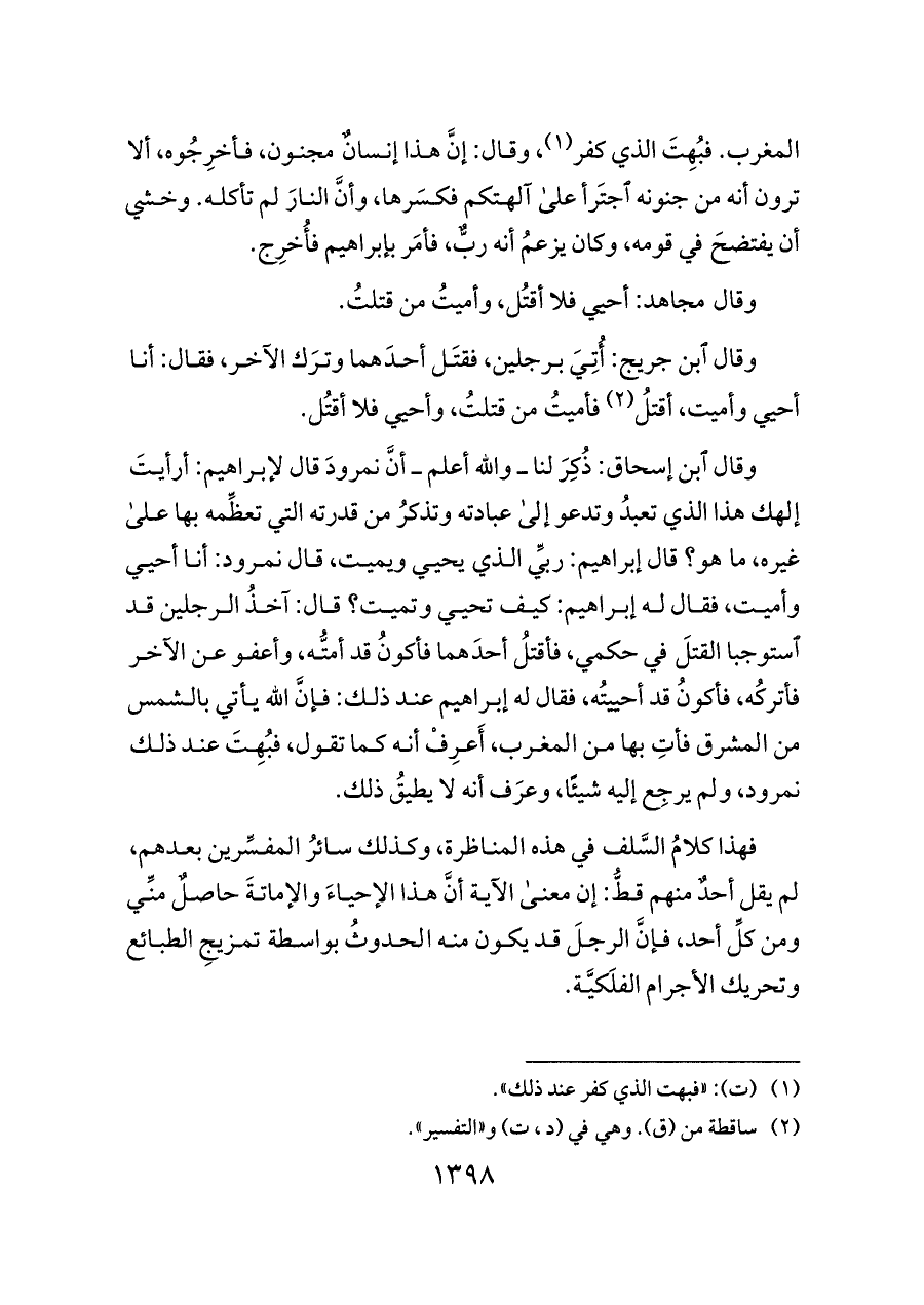 فهذا كلامُ السَّلف في هذه المناظرة، وكذلك سائرُ المفسِّرين بعدهم، لم يقل أحدٌ منهم قطُّ: إن معنى الآية أنَّ هذا الإحياءَ والإماتةَ حاصلٌ منِّي ومن كلِّ أحد، فإنَّ الرجلَ قد يكون منه الحدوثُ بواسطة تمزيجِ الطبائع وتحريك الأجرام الفلَكيَّة.