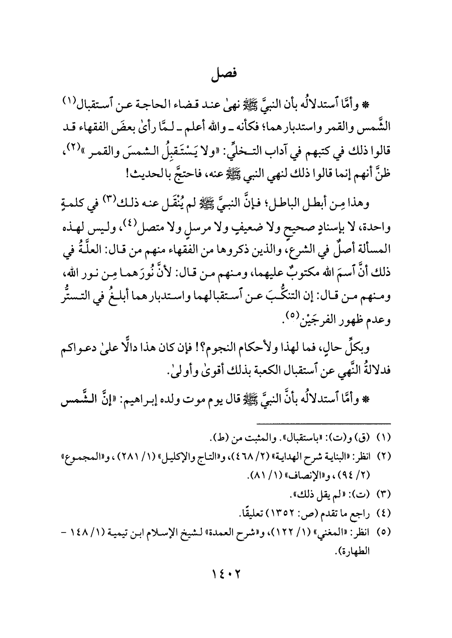 * وأمَّا استدلالُه بأن النبيَّ - صلى الله عليه وسلم - نهى عند قضاء الحاجة عن استقبال (¬١) الشَّمس والقمر واستدبارهما؛ فكأنه ــ والله أعلم ــ لمَّا رأى بعضَ الفقهاء قد قالوا ذلك في كتبهم في آداب التخلِّي: «ولا يَسْتَقبِلُ الشمسَ والقمر» (¬٢)، ظنَّ أنهم إنما قالوا ذلك لنهي النبي - صلى الله عليه وسلم - عنه، فاحتجَّ بالحديث!