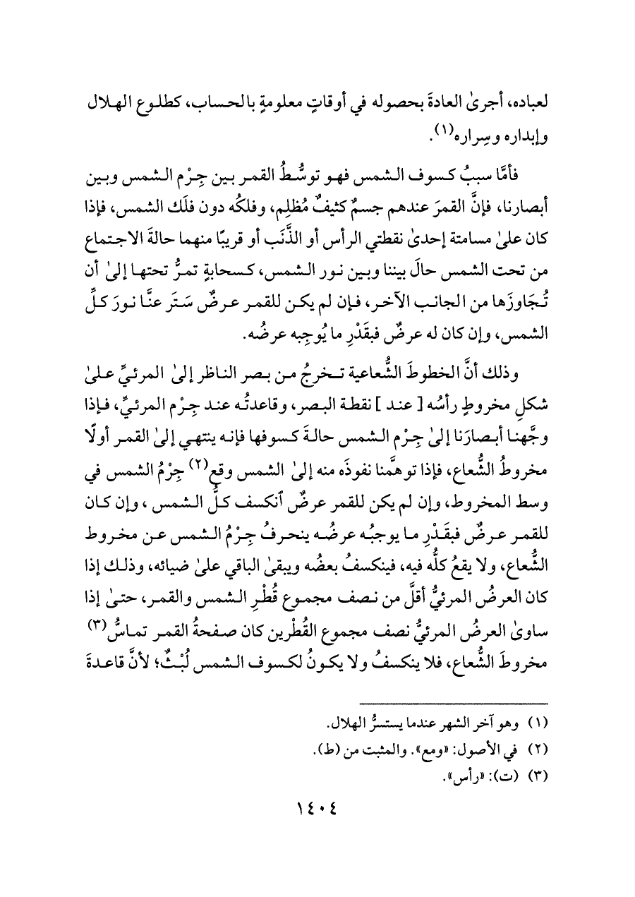 وذلك أنَّ الخطوطَ الشُّعاعية تخرجُ من بصر الناظر إلى المرئيِّ على شكلِ مخروطٍ رأسُه [عند] نقطة البصر، وقاعدتُه عند جِرْم المرئيِّ، فإذا وجَّهنا أبصارَنا إلى جِرْم الشمس حالةَ كسوفها فإنه ينتهي إلى القمر أولًا مخروطُ الشُّعاع، فإذا توهَّمنا نفوذَه منه إلى الشمس وقع (¬٢) جِرْمُ الشمس في وسط المخروط، وإن لم يكن للقمر عرضٌ انكسف كلُّ الشمس , وإن كان للقمر عرضٌ فبقَدْرِ ما يوجبُه عرضُه ينحرفُ جِرْمُ الشمس عن مخروط الشُّعاع، ولا يقعُ كلُّه فيه، فينكسفُ بعضُه ويبقى الباقي على ضيائه، وذلك إذا كان العرضُ المرئيُّ أقلَّ من نصف مجموع قُطْرِ الشمس والقمر، حتى إذا ساوى العرضُ المرئيُّ نصف مجموع القُطْرين كان صفحةُ القمر تماسُّ (¬٣) مخروطَ الشُّعاع، فلا ينكسفُ ولا يكونُ لكسوف الشمس لُبْثٌ؛ لأنَّ قاعدةَ