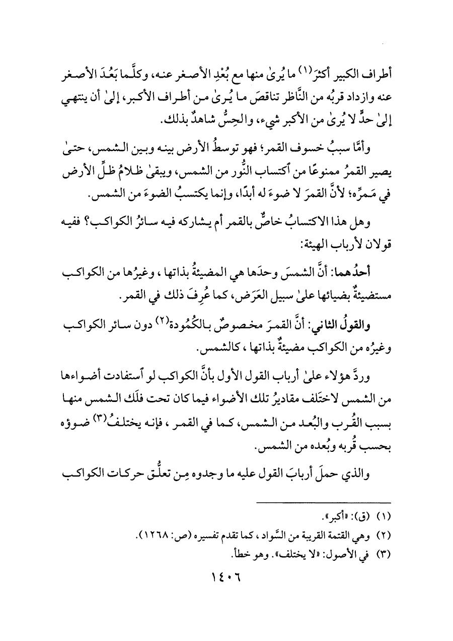 وردَّ هؤلاء على أرباب القول الأول بأنَّ الكواكب لو استفادت أضواءها من الشمس لاختَلف مقاديرُ تلك الأضواء فيما كان تحت فلَك الشمس منها بسبب القُرب والبُعد من الشمس، كما في القمر , فإنه يختلفُ (¬٣) ضوؤه بحسب قُربه وبُعده من الشمس.
