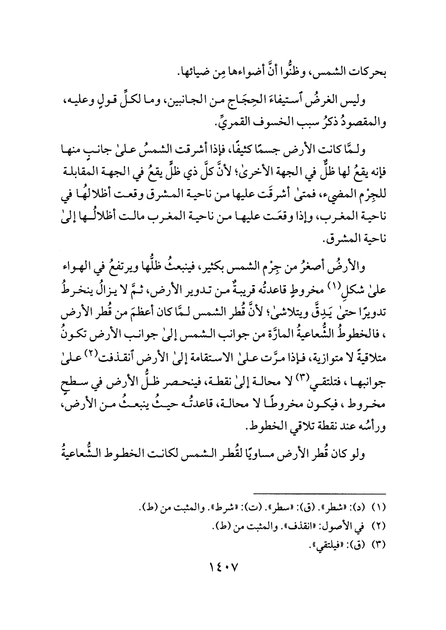 والأرضُ أصغرُ من جِرْم الشمس بكثير، فينبعثُ ظلُّها ويرتفعُ في الهواء على شكلِ (¬١) مخروطٍ قاعدتُه قريبةٌ من تدوير الأرض، ثمَّ لا يزالُ ينخرطُ تدويرًا حتى يَدِقَّ ويتلاشى؛ لأنَّ قُطر الشمس لمَّا كان أعظمَ من قُطر الأرض , فالخطوطُ الشُّعاعيةُ المارَّة من جوانب الشمس إلى جوانب الأرض تكونُ متلاقيةً لا متوازية، فإذا مرَّت على الاستقامة إلى الأرض انقذفت (¬٢) على جوانبها , فتلتقي (¬٣) لا محالة إلى نقطة، فينحصر ظلُّ الأرض في سطحٍ مخروط , فيكون مخروطًا لا محالة، قاعدتُه حيثُ ينبعثُ من الأرض، ورأسُه عند نقطة تلاقي الخطوط.