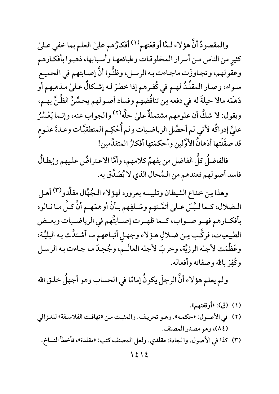 والمقصودُ أنَّ هؤلاء لمَّا أوقعَتهم (¬١) أفكارُهم على العلم بما خفي على كثيرٍ من الناس من أسرار المخلوقات وطبائعها وأسبابها، ذهبوا بأفكارهم وعقولهم، وتجاوزَت ماجاءت به الرسل، وظنُّوا أنَّ إصابتهم في الجميع سواء، وصار المقلِّدُ لهم في كُفرهم إذا خطرَ له إشكالٌ على مذهبهم أو دَهَمَه مالا حيلةَ له في دفعه مِن تناقُضهم وفساد أصولهم يحسِّنُ الظَّنَّ بهم، ويقول: لا شكَّ أن علومهم مشتملةٌ على حلِّه (¬٢) والجواب عنه، وإنما يَعْسُرُ عليَّ إدراكُه لأني لم أحصِّل الرياضيات ولم أُحْكِم المنطقيَّات وعدةَ علومٍ قد صقَلَتها أذهانُ الأوَّلين وأحكمَتها أفكارُ المتقدِّمين!