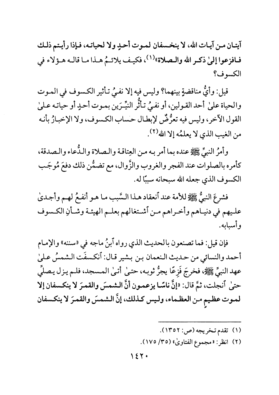 فإن قيل: فما تصنعون بالحديث الذي رواه ابنُ ماجه في «سننه» والإمام أحمد والنسائي من حديث النعمان بن بشير قال: انكسفَت الشمسُ على عهد النبيِّ - صلى الله عليه وسلم -، فخرجَ فَزِعًا يجرُّ ثوبه، حتى أتى المسجد، فلم يزل يصلِّي حتى انجلت، ثمَّ قال: «إنَّ ناسًا يزعمون أنَّ الشمسَ والقمرَ لا ينكسفان