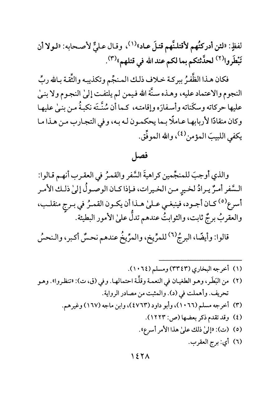 فكان هذا الظَّفرُ ببركة خلاف ذلك المنجِّم وتكذيبه والثِّقة بالله ربِّ النجوم والاعتماد عليه، وهذه سنَّة الله فيمن لم يلتفت إلى النجوم ولا بنى عليها حركاته وسكَناته وأسفارَه وإقامته، كما أن سُنَّتَه نكبةُ من بنى عليها وكان منقادًا لأربابها عاملًا بما يحكمون له به، وفي التجارب من هذا ما يكفي اللبيبَ المؤمن (¬٥)، والله الموفِّق.