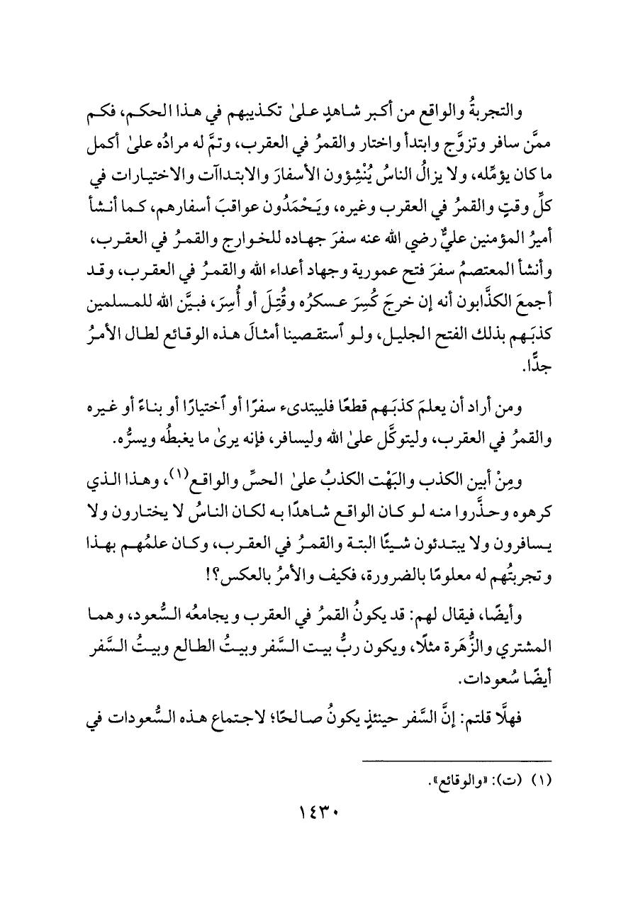 والتجربةُ والواقع من أكبر شاهدٍ على تكذيبهم في هذا الحكم، فكم ممَّن سافر وتزوَّج وابتدأ واختار والقمرُ في العقرب، وتمَّ له مرادُه على أكمل ما كان يؤمِّله، ولا يزالُ الناسُ يُنْشِؤون الأسفارَ والابتداآت والاختيارات في كلِّ وقتٍ والقمرُ في العقرب وغيره، ويَحْمَدُون عواقبَ أسفارهم، كما أنشأ أميرُ المؤمنين عليٌّ رضي الله عنه سفرَ جهاده للخوارج والقمرُ في العقرب، وأنشأ المعتصمُ سفرَ فتح عمورية وجهاد أعداء الله والقمرُ في العقرب، وقد أجمعَ الكذَّابون أنه إن خرجَ كُسِرَ عسكرُه وقُتِلَ أو أُسِرَ، فبيَّن الله للمسلمين كذبَهم بذلك الفتح الجليل، ولو استقصينا أمثالَ هذه الوقائع لطال الأمرُ جدًّا.