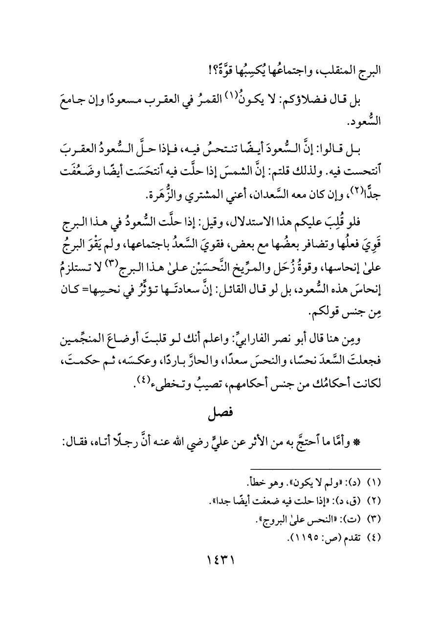 ومِن هنا قال أبو نصر الفارابيِّ: واعلم أنك لو قلبتَ أوضاعَ المنجِّمين فجعلتَ السَّعدَ نحسًا، والنحسَ سعدًا، والحارَّ باردًا، وعكسَه، ثم حكمتَ، لكانت أحكامُك من جنس أحكامهم، تصيبُ وتخطاء (¬٤).