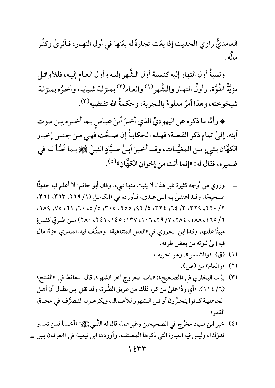 * وأمَّا ما ذكره عن اليهوديِّ الذي أخبرَ ابنَ عباسٍ بما أخبره مِن موت ابنه، إلى تمام ذكر القصة؛ فهذه الحكايةُ إن صحَّت فهي من جنس إخبار الكهَّان بشيءٍ من المغيَّبات، وقد أخبرَ ابنُ صيَّادٍ النبيَّ - صلى الله عليه وسلم - بما خَبَّأ له في ضميره، فقال له: «إنما أنت من إخوان الكهَّان» (¬٤).