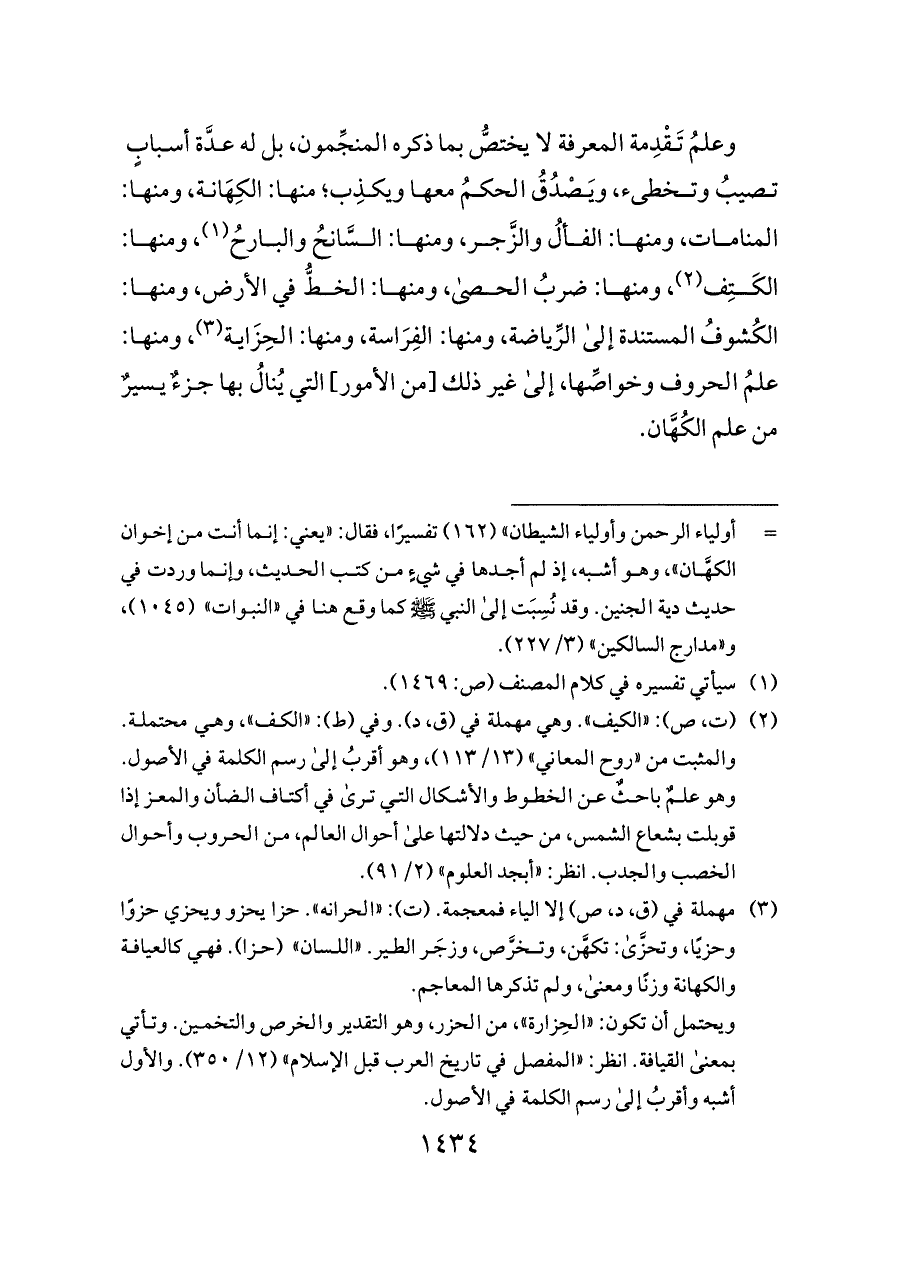 (¬٢) (ت، ص): «الكيف». وهي مهملة في (ق، د). وفي (ط): «الكف»، وهي محتملة. والمثبت من «روح المعاني» (١٣/ ١١٣)، وهو أقربُ إلى رسم الكلمة في الأصول. وهو علمٌ باحثٌ عن الخطوط والأشكال التي ترى في أكتاف الضأن والمعز إذا قوبلت بشعاع الشمس، من حيث دلالتها على أحوال العالم، من الحروب وأحوال الخصب والجدب. انظر: «أبجد العلوم» (٢/ ٩١).