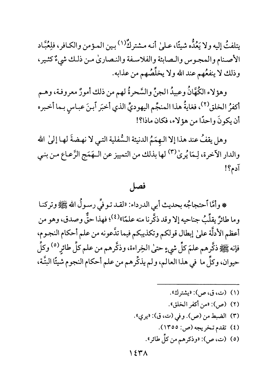 * وأمَّا احتجاجُه بحديث أبي الدرداء: «لقد توفِّي رسولُ الله - صلى الله عليه وسلم - وتركنا وما طائرٌ يقلِّبُ جناحيه إلا وقد ذكَّرنا منه علمًا» (¬٤)؛ فهذا حقٌّ وصدق، وهو من أعظم الأدلَّة على إبطال قولكم وتكذيبكم فيما تدَّعونه من علم أحكام النجوم، فإنه - صلى الله عليه وسلم - ذكَّرهم علمَ كلِّ شيءٍ حتى الخِراءة، وذكَّرهم من علم كلِّ طائرٍ (¬٥) وكلِّ حيوان، وكلِّ ما في هذا العالم، ولم يذكِّرهم من علم أحكام النجوم شيئًا البتَّة،