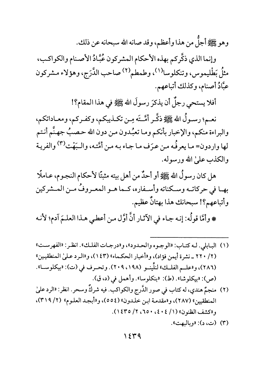 هل كان رسولُ الله - صلى الله عليه وسلم - أو أحدٌ من أهل بيته مثبتًا لأحكام النجوم، عاملًا بها في حركاته وسكناته وأسفاره، كما هو المعروفُ من المشركين وأتباعهم؟! سبحانك هذا بهتانٌ عظيم.