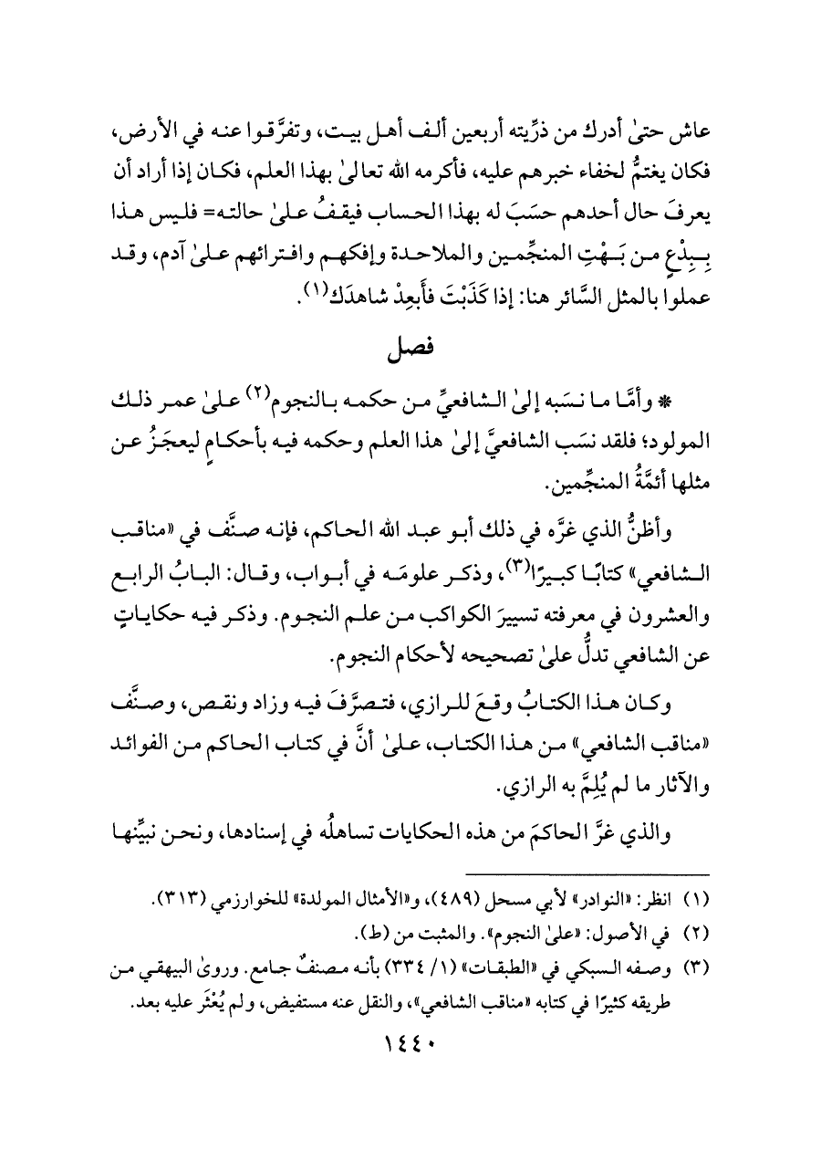 * وأمَّا ما نسَبه إلى الشافعيِّ من حكمه بالنجوم (¬٢) على عمر ذلك المولود؛ فلقد نسَب الشافعيَّ إلى هذا العلم وحكمه فيه بأحكامٍ ليعجَزُ عن مثلها أئمَّةُ المنجِّمين.