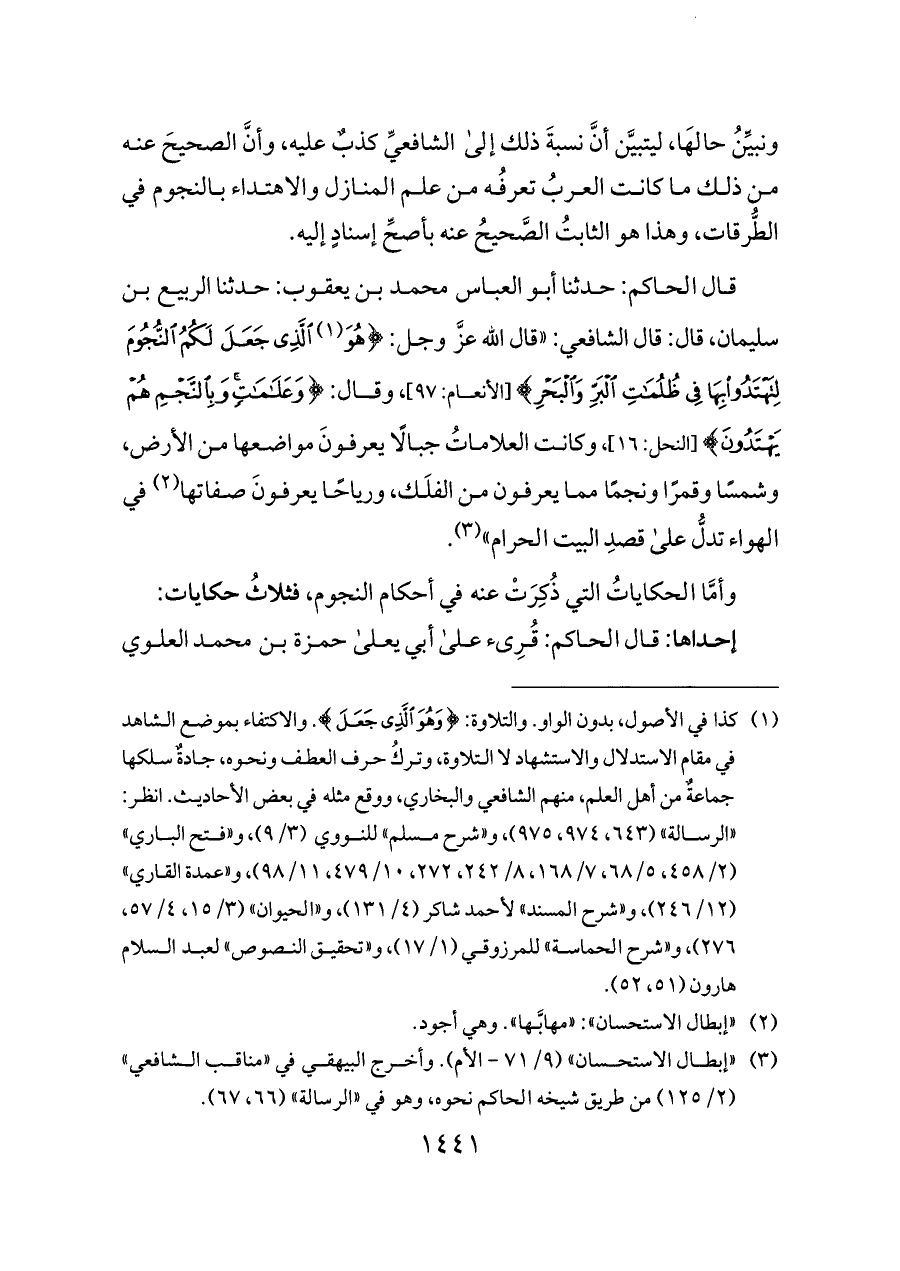 قال الحاكم: حدثنا أبو العباس محمد بن يعقوب: حدثنا الربيع بن سليمان، قال: قال الشافعي: «قال الله عزَّ وجل: {هُوَ (¬١) الَّذِي جَعَلَ لَكُمُ النُّجُومَ لِتَهْتَدُوا بِهَا فِي ظُلُمَاتِ الْبَرِّ وَالْبَحْرِ} [الأنعام: ٩٧]، وقال: {وَعَلَامَاتٍ وَبِالنَّجْمِ هُمْ يَهْتَدُونَ} [النحل: ١٦]، وكانت العلاماتُ جبالًا يعرفونَ مواضعها من الأرض، وشمسًا وقمرًا ونجمًا مما يعرفون من الفلَك، ورياحًا يعرفونَ صفاتها (¬٢) في الهواء تدلُّ على قصدِ البيت الحرام» (¬٣).