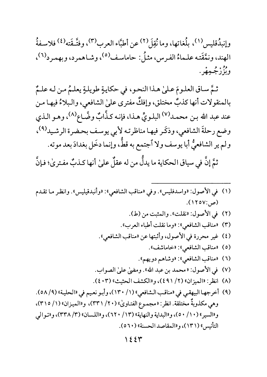(¬٣) «مناقب الشافعي»: «وما نقلت أطباء العرب».