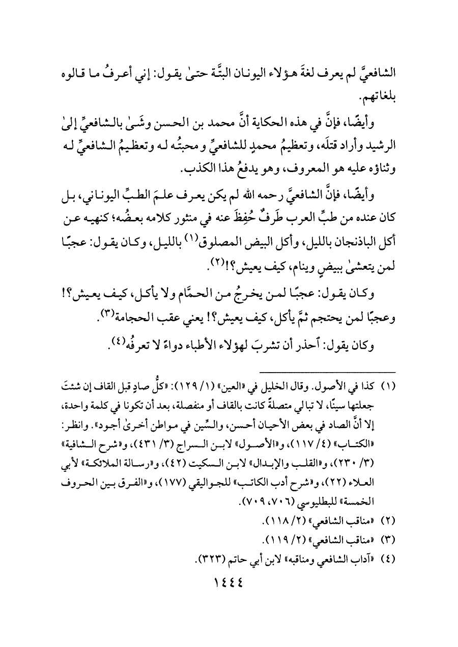 الشافعيَّ لم يعرف لغةَ هؤلاء اليونان البتَّة حتى يقول: إني أعرفُ ما قالوه بلغاتهم.