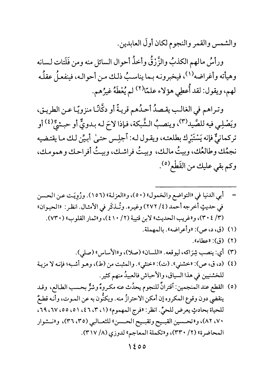 وتراهم في الغالب يقصدُ أحدُهم قريةً أو دكَّانًا منزويًا عن الطريق، ويَصْلِي فيه للصَّيد (¬٣)، وينصبُ الشَّبكة، فإذا لاحَ له بدويٌّ أو حبشيٌّ (¬٤) أو تركمانيٌّ فإنه يَسْتَبْرِك بطلعته، ويقول له: اجلِس حتى أبيِّن لك ما يقتضيه نجمُك وطالعُك، وبيتُ مالك، وبيتُ فراشك، وبيتُ أفراحك وهمومك، وكم بقي عليك من القَطْع (¬٥).