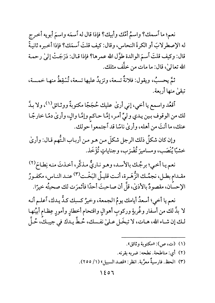 اقعُد واسمع يا أخي، إني أرى عليك حُجَجًا مكتوبةً ووثائق (¬١)، ولا بدَّ لك من الوقوف بين يدي وليِّ أمر، إمَّا حاكمٍ وإمَّا والٍ، وأرى دمًا خارجًا عنك، ما أنتَ من أهله، وأرى ناسًا قد اجتمعوا حولك.