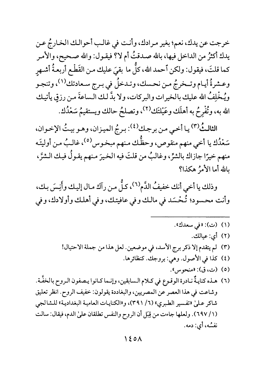 خرجت عن يدك، نعم؛ بغير مرادك، وأنت في غالب أحوالك الخارجُ عن يدك أكثرُ من الداخل فيها، بالله صدقتُ أم لا؟ فيقول: والله صحيح، والأمر كما قلتَ، فيقول: ولكن احمد الله، كلُّ ما بقيَ عليك من القَطْع أربعةُ أشهرٍ وعشرةُ أيام وتخرجُ من نحسك، وتدخلُ في برج سعادتك (¬١)، وتنجو ويُخْلِفُ الله عليك بالخيرات والبركات، ولا بدَّ لك الساعةَ من رزقٍ يأتيك الله به، وتُفْرِحُ به أهلَك وعَيْلتَك (¬٢)، وتصلحُ حالك ويستقيمُ سَعْدُك.