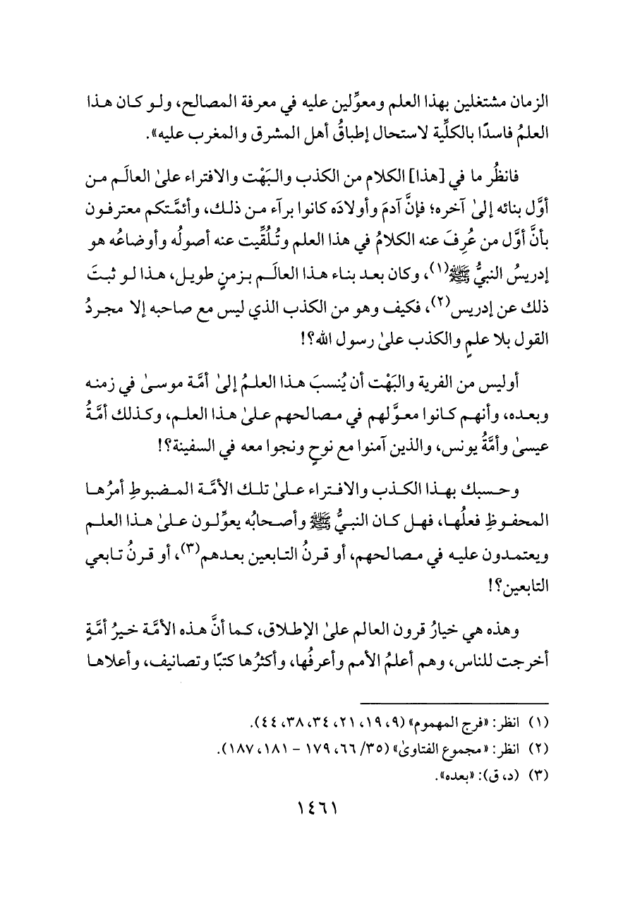 وحسبك بهذا الكذب والافتراء على تلك الأمَّة المضبوطِ أمرُها المحفوظِ فعلُها، فهل كان النبيُّ - صلى الله عليه وسلم - وأصحابُه يعوِّلون على هذا العلم ويعتمدون عليه في مصالحهم، أو قرنُ التابعين بعدهم (¬٣)، أو قرنُ تابعي التابعين؟!