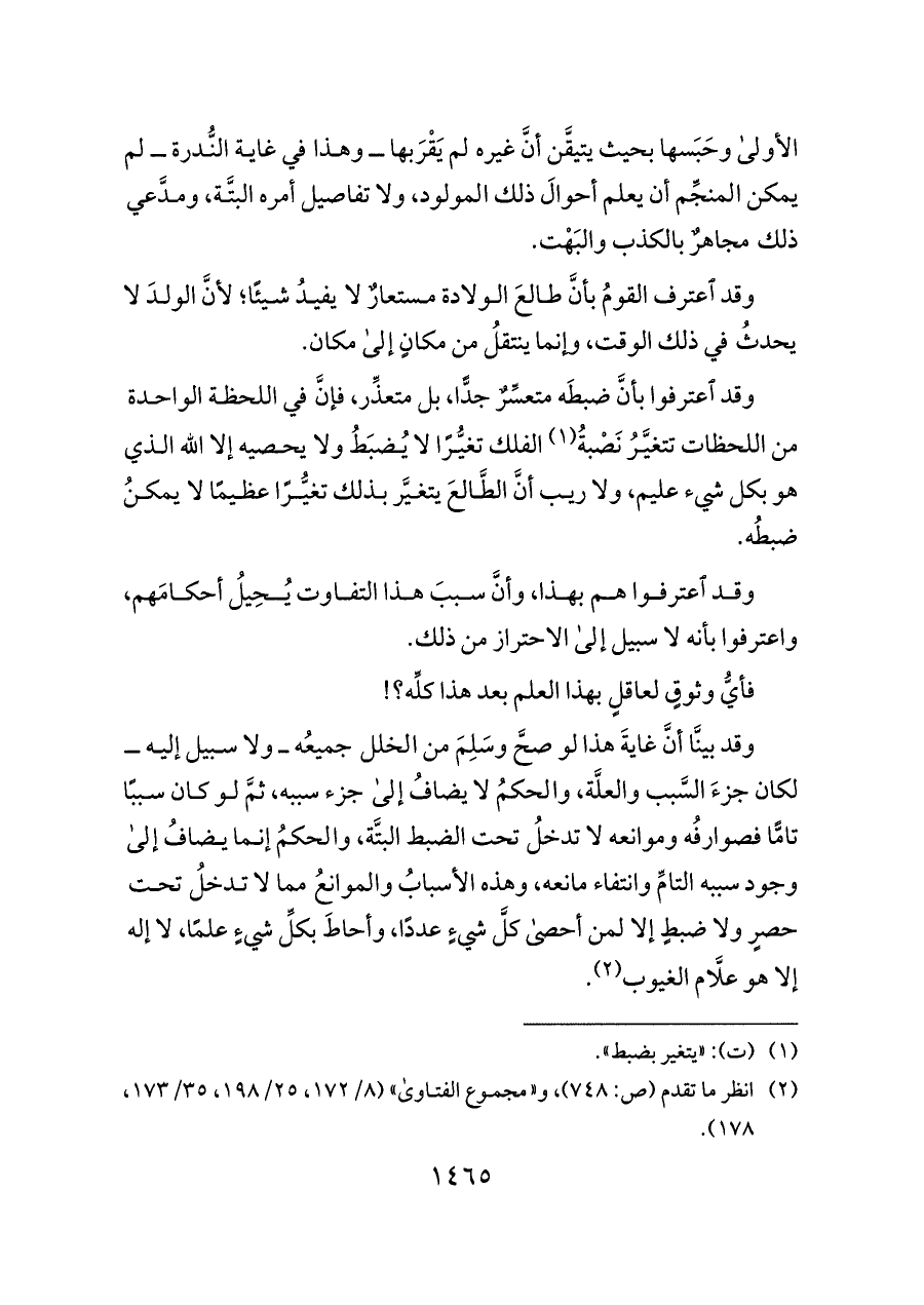 الأولى وحَبَسها بحيث يتيقَّن أنَّ غيره لم يَقْرَبها ــ وهذا في غاية النُّدرة ــ لم يمكن المنجِّم أن يعلم أحوالَ ذلك المولود، ولا تفاصيل أمره البتَّة، ومدَّعي ذلك مجاهرٌ بالكذب والبَهْت.