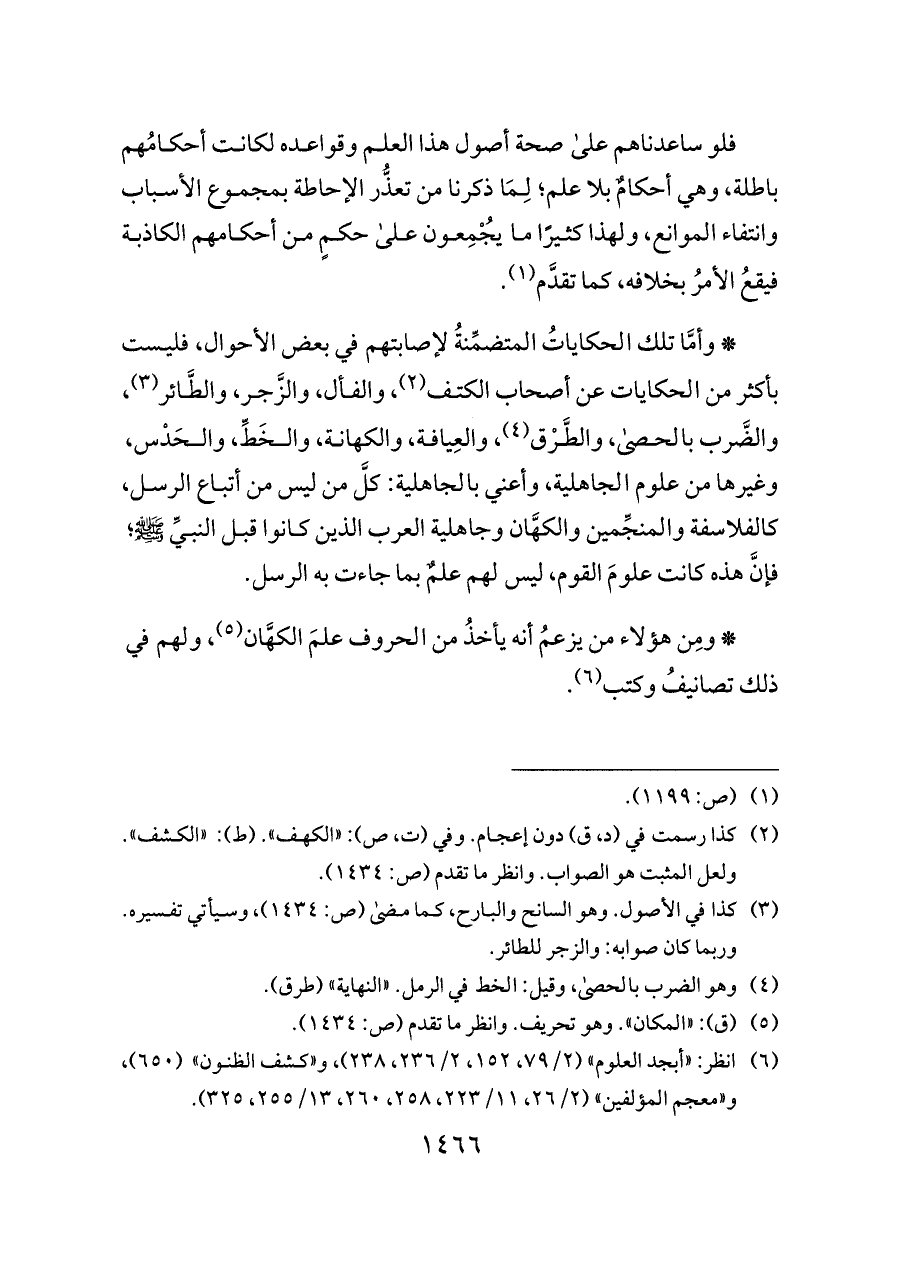 * وأمَّا تلك الحكاياتُ المتضمِّنةُ لإصابتهم في بعض الأحوال، فليست بأكثر من الحكايات عن أصحاب الكتف (¬٢)، والفأل، والزَّجر، والطَّائر (¬٣)، والضَّرب بالحصى، والطَّرْق (¬٤)، والعِيافة، والكهانة، والخَطِّ، والحَدْس، وغيرها من علوم الجاهلية، وأعني بالجاهلية: كلَّ من ليس من أتباع الرسل، كالفلاسفة والمنجِّمين والكهَّان وجاهلية العرب الذين كانوا قبل النبيِّ - صلى الله عليه وسلم -؛ فإنَّ هذه كانت علومَ القوم، ليس لهم علمٌ بما جاءت به الرسل.