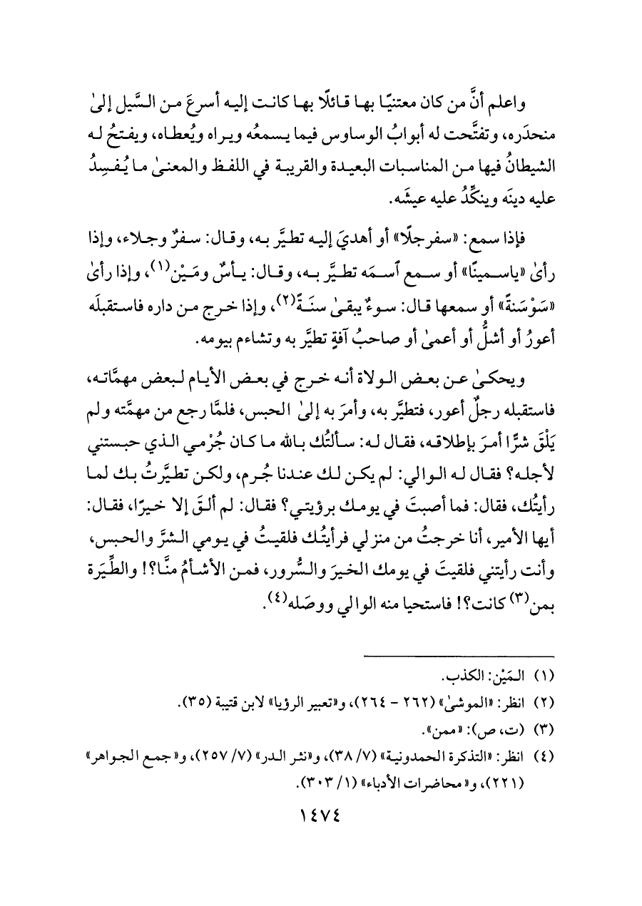 واعلم أنَّ من كان معتنيًا بها قائلًا بها كانت إليه أسرعَ من السَّيل إلى منحدَره، وتفتَّحت له أبوابُ الوساوس فيما يسمعُه ويراه ويُعطاه، ويفتحُ له الشيطانُ فيها من المناسبات البعيدة والقريبة في اللفظ والمعنى ما يُفسِدُ عليه دينَه وينكِّدُ عليه عيشَه.