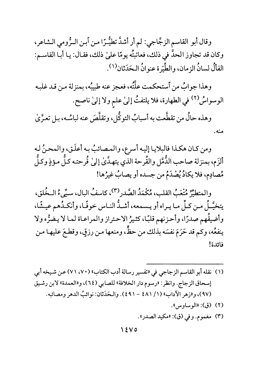 وقال أبو القاسم الزجَّاجي: لم أر أشدَّ تطيُّرًا من ابن الرُّومي الشاعر، وكان قد تجاوز الحدَّ في ذلك، فعاتبتُه يومًا على ذلك، فقال: يا أبا القاسم: الفألُ لسانُ الزمان، والطِّيَرة عنوانُ الحَدَثان (¬١).